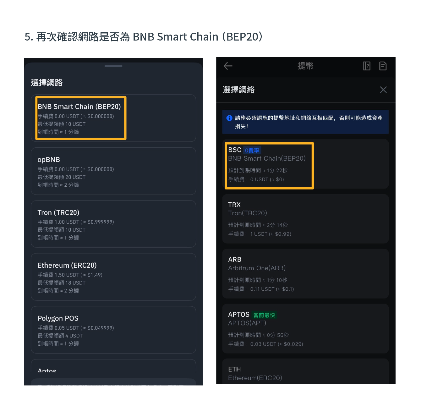 因Spark Lands 系統部署於 BNB Smart Chain 上,並以 BEP-20 標準發行,所以當您欲將購買的 USDT 轉入您於 Spark Lands 的錢包時,請務必選擇 BNB Smart Chain(BEP-20)網絡,確保您的資產能正確轉入。